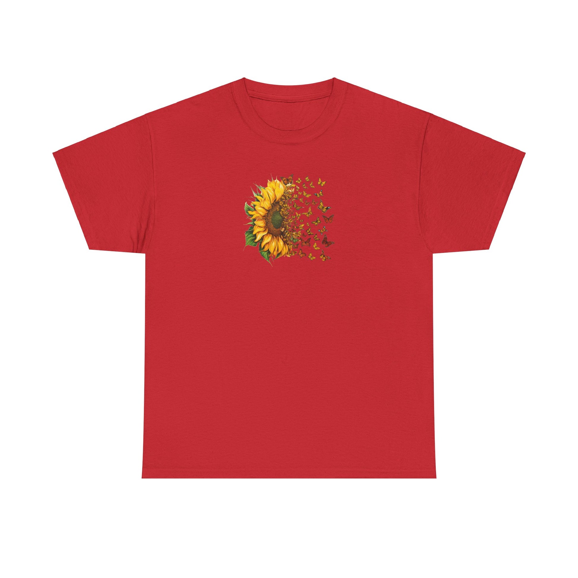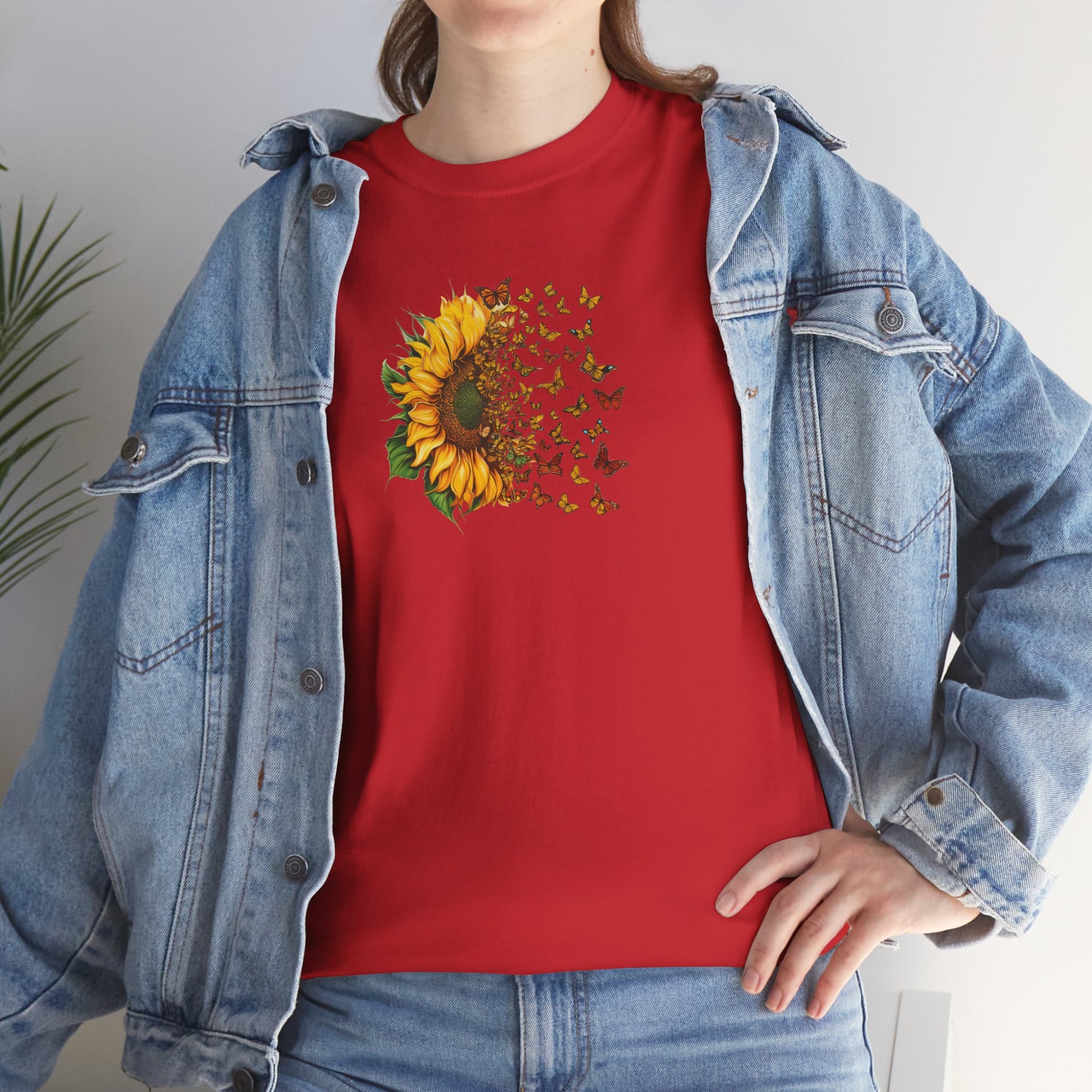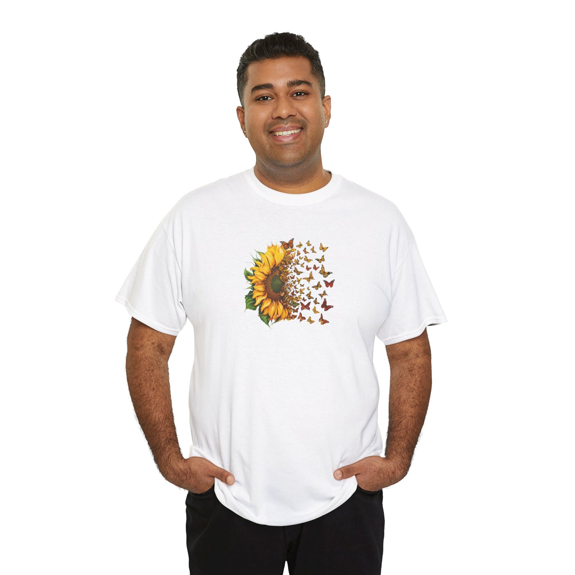 The sunflower, symbol of the sun itself, is depicted in mid-metamorphosis, its core a whirlpool of life that spirals outwards into a flight of vibrant butterflies. Each butterfly seems to take off from the fabric, inviting onlookers into a story of transformation that echoes our own personal evolutions. With every movement, the T-Shirt becomes a dynamic display of nature’s perpetual motion, a stunning tribute to the resilience and beauty of life.