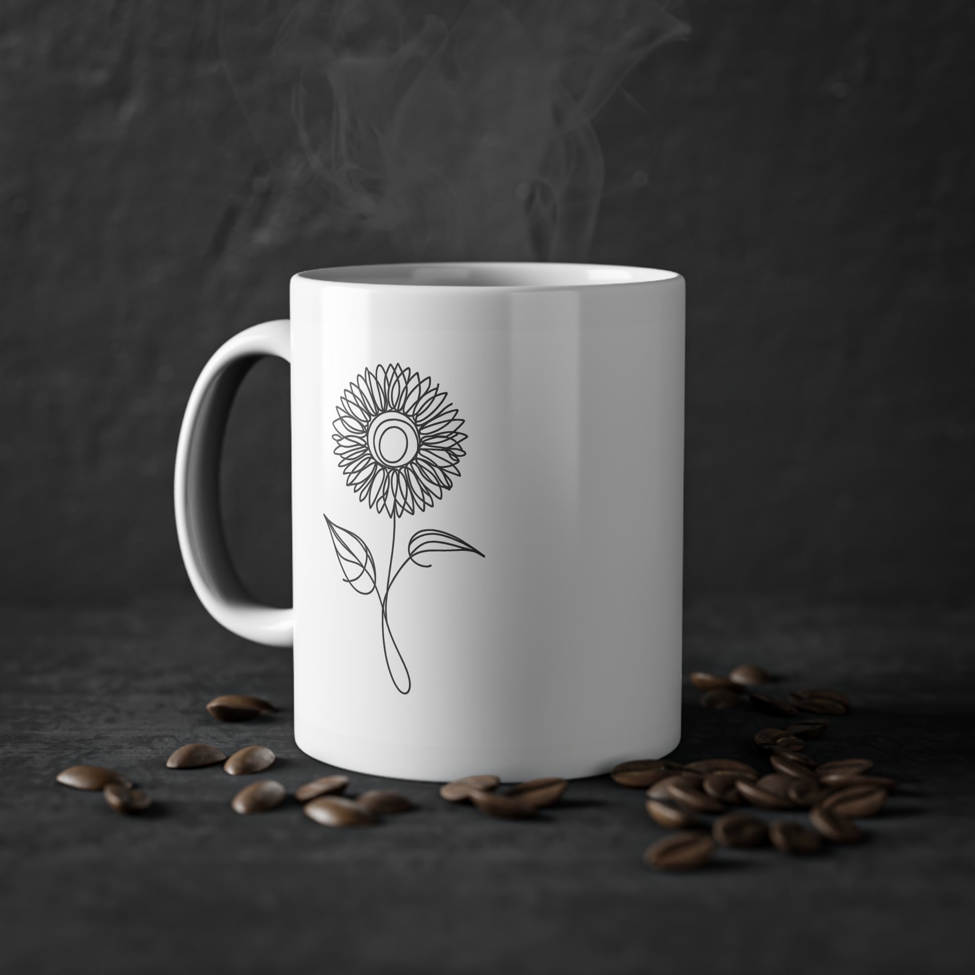 With the Sunflower Line Drawing Coffee Cup, experience minimalism that speaks volumes. The continuous line art of the sunflower captures the bloom’s cycle from dawn to dusk, marrying the simplicity of nature with the ritual of your daily coffee.