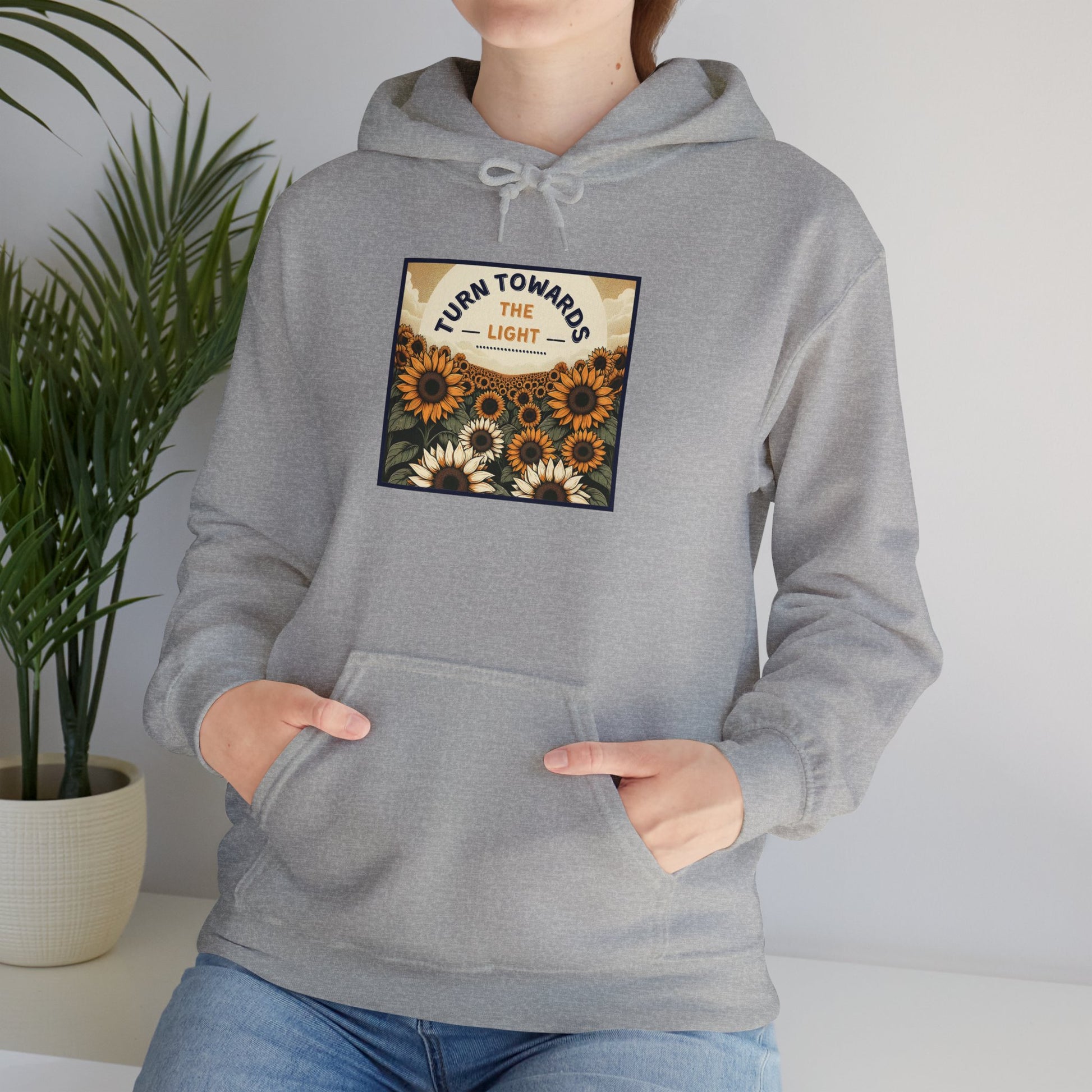 Long ago, in a serene village surrounded by nature, there was a field of sunflowers. These weren't just any sunflowers—they held a secret. With their faces always towards the sun, they symbolized boundless hope. An artist from this village, taken by their beauty and the story they told, transferred this imagery onto a canvas. This hoodie carries forward that legacy, urging us to "Turn Towards the Light".