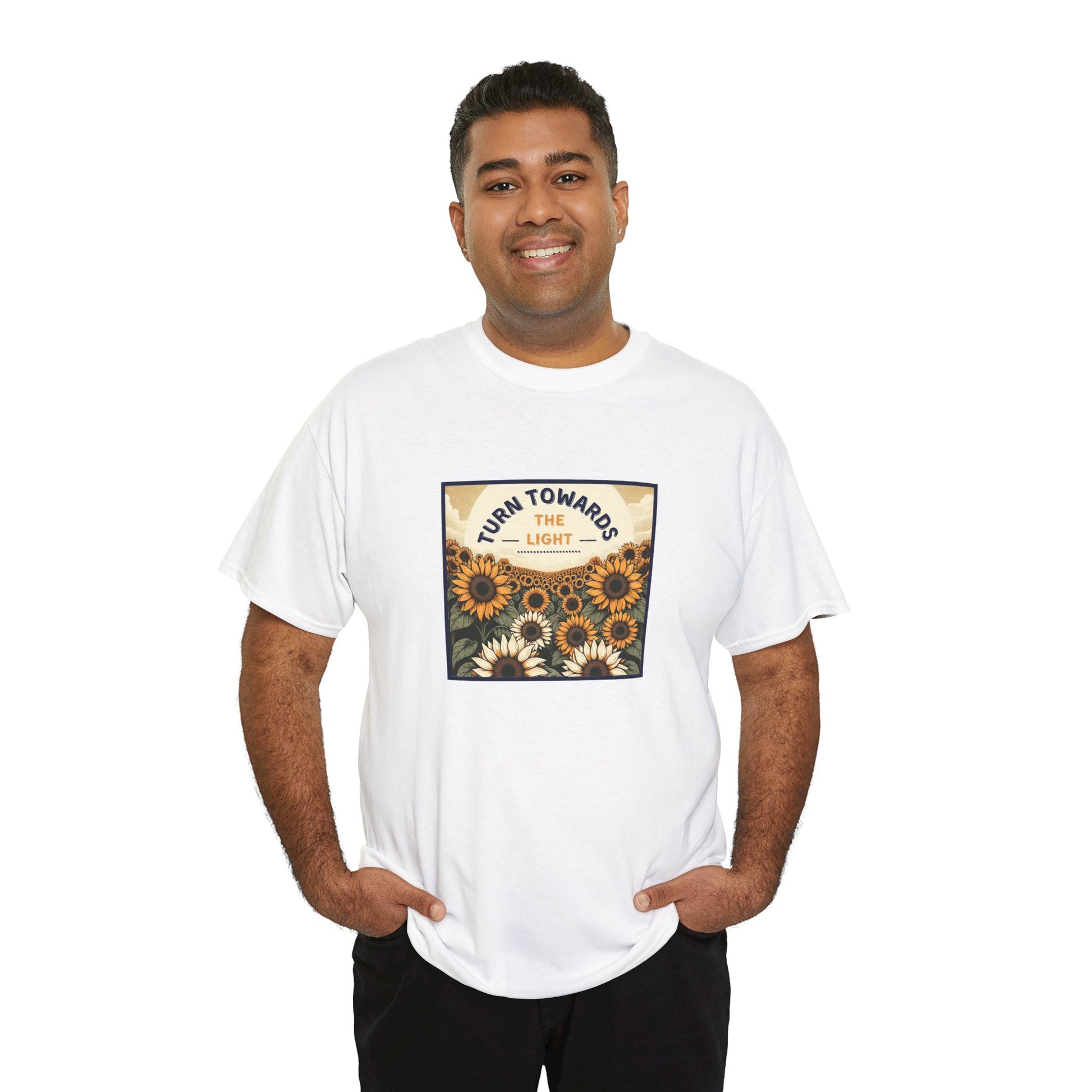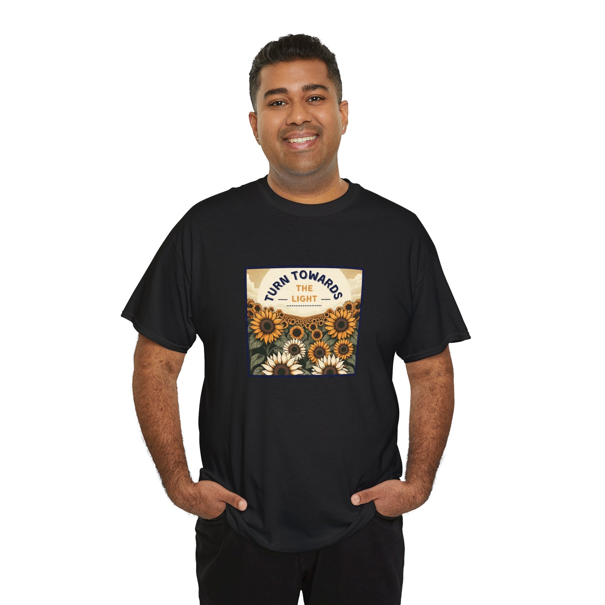 In a quaint village, there once lay a field of sunflowers, standing tall and radiant, facing the sun. The villagers believed these flowers held a secret - they possessed the magic of unwavering optimism. An artist from the village, inspired by their beauty and tale, decided to bring these sunflowers onto a canvas. This tee pays homage to that artwork, reminding us always to "Turn Towards the Light".